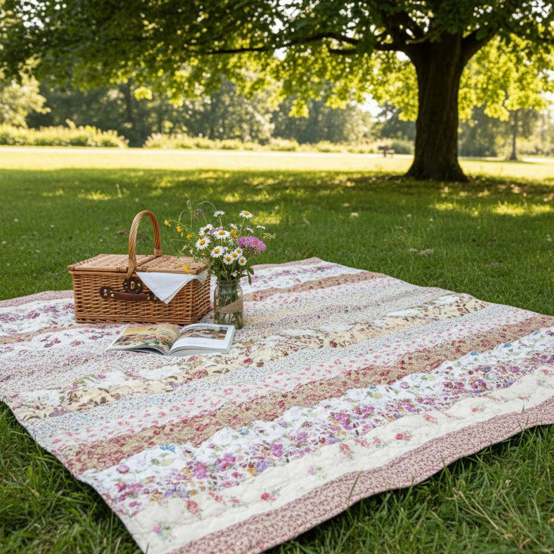 Alle Materialien sind aufgrund ihrer Robustheit und Farbbeständigkeit ausgewählt, sodass die Decke auch nach häufiger Wäsche und Nutzung schön bleibt. Die wendbare Rückseite mit zartem Blumenmuster bietet zwei Designs in einem und macht die Decke ebenso funktional wie dekorativ.