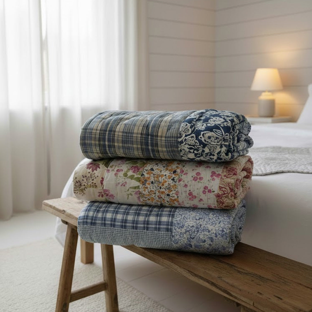Gefertigt aus 100 % Baumwolle mit einer leichten Polyesterfüllung ist die Decke weich, atmungsaktiv und das ganze Jahr über äußerst angenehm in der Verwendung. Die handgequiltete Verarbeitung sorgt für hohe Stabilität und eine langlebige Qualität, die auch bei täglichem Gebrauch viele Jahre ihre Form behält.
