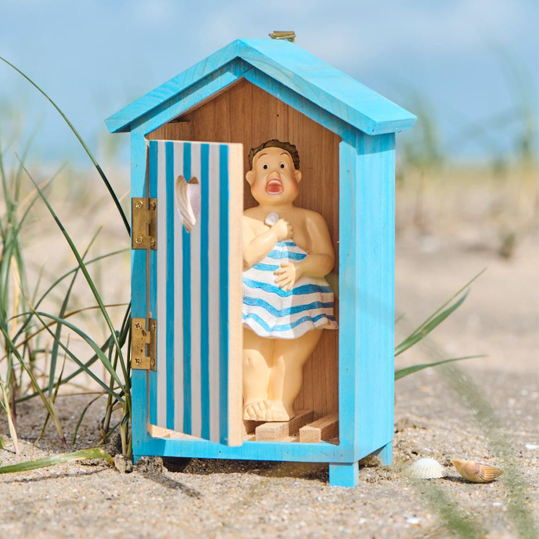 Hinter der Tür dieses charmanten Badehauses macht sich ein Herr bereit für den Strandtag. Das maritime Design und die humorvollen Details verleihen der Dekoration viel Persönlichkeit und sorgen sofort für Sommer- und Urlaubsstimmung.