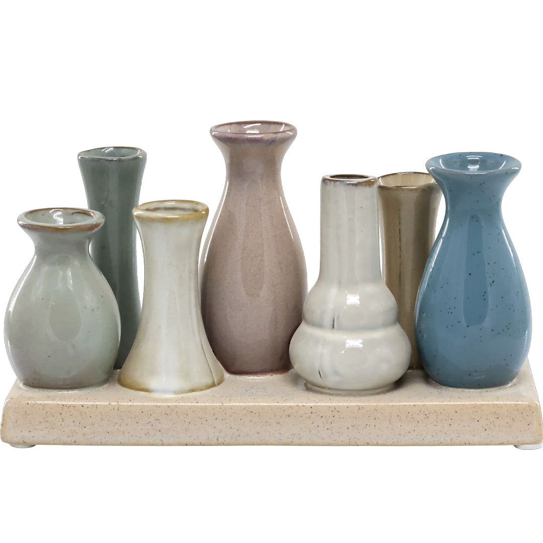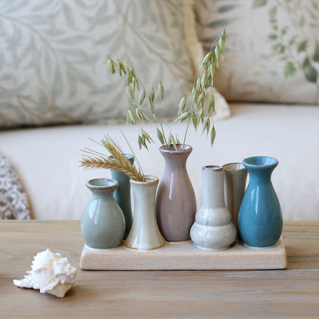 Dekoratives Set mit kleinen Vasen auf einem passenden Tablett, gefertigt aus Steinzeug in schönen, dezent abgestimmten Farben. Perfekt für einzelne Blumen, Zweige oder Trockenstiele und ideal als Centerpiece auf dem Tisch oder der Fensterbank. Ein kleines Statement, das Ruhe und Abwechslung in die Einrichtung bringt.