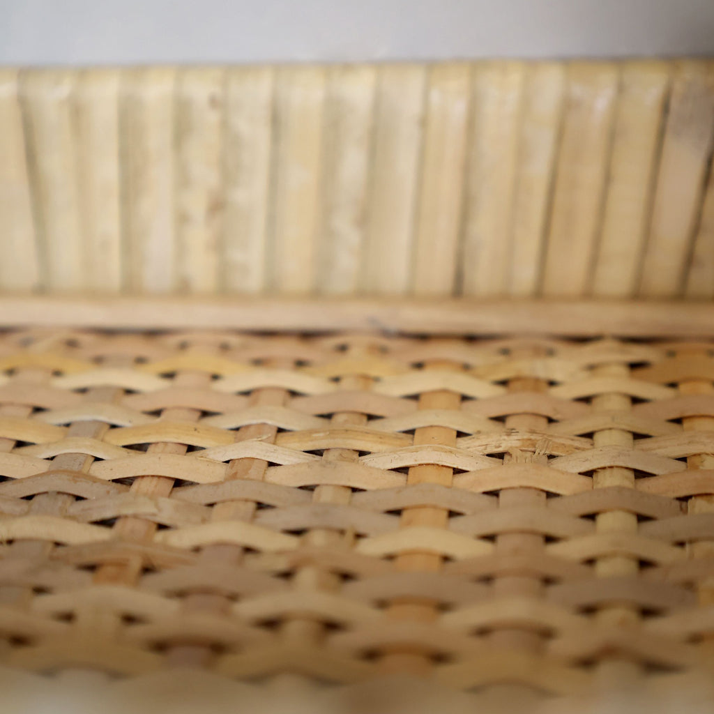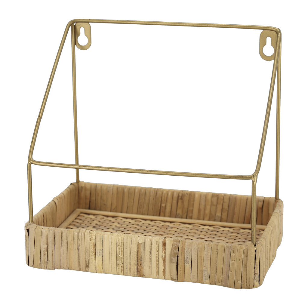 Dekoratives und funktionales Regal mit Geflecht, gefertigt in einer eleganten Kombination aus Eisen und natürlichem Rattan. Der messingfarbene Rahmen verleiht dem Regal eine leichte und exklusive Ausstrahlung, während die geflochtene Ablage Wärme und Struktur hinzufügt. Dieses Regal ist die kleinste Variante der Serie und eignet sich perfekt für kleinere Wände oder als Teil einer harmonischen Anordnung mit den anderen Größen.