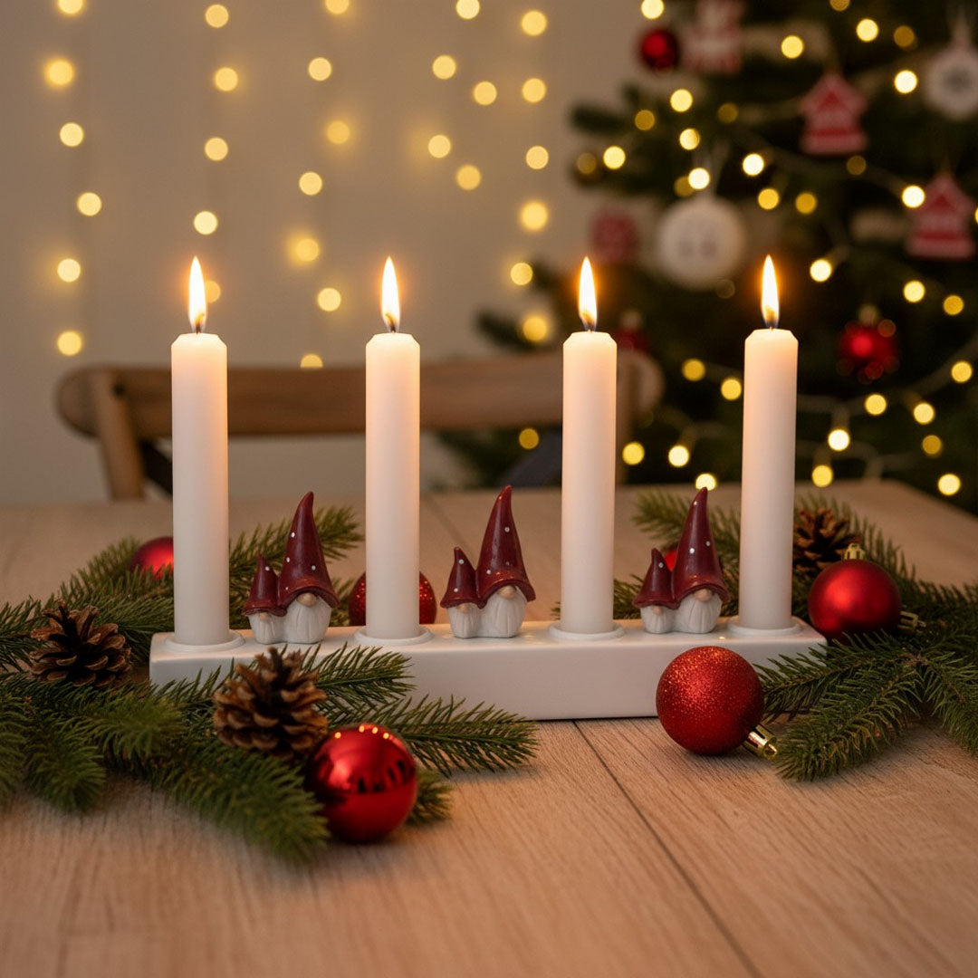 Schaffen Sie Weihnachtsstimmung und Gemütlichkeit in Ihrem Zuhause mit diesem eleganten Adventskranz von Harvesttime. Der Kerzenhalter ist in schlichtem Weiß gehalten und mit kleinen Wichteln mit roten Mützen dekoriert, was ihm einen modernen und zugleich klassischen Ausdruck verleiht.