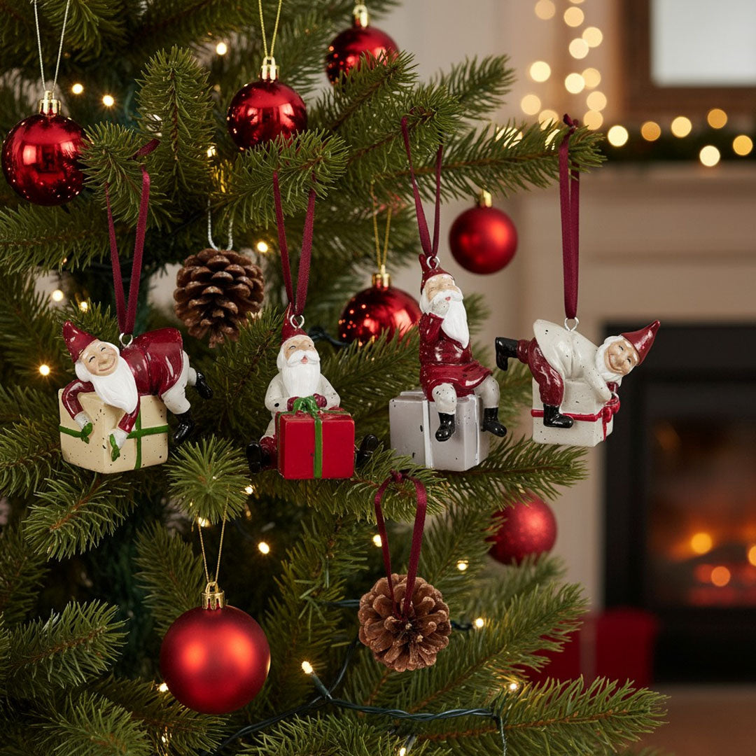 Die Figuren sind detailreich aus glasierter Keramik gefertigt und eignen sich perfekt als Baumschmuck oder als kreative Ergänzung zu winterlichen Deko-Arrangements. Die farblich abgestimmten Schleifen ermöglichen einfaches Aufhängen, egal ob am Fenster, Kranz oder Tannenzweig.