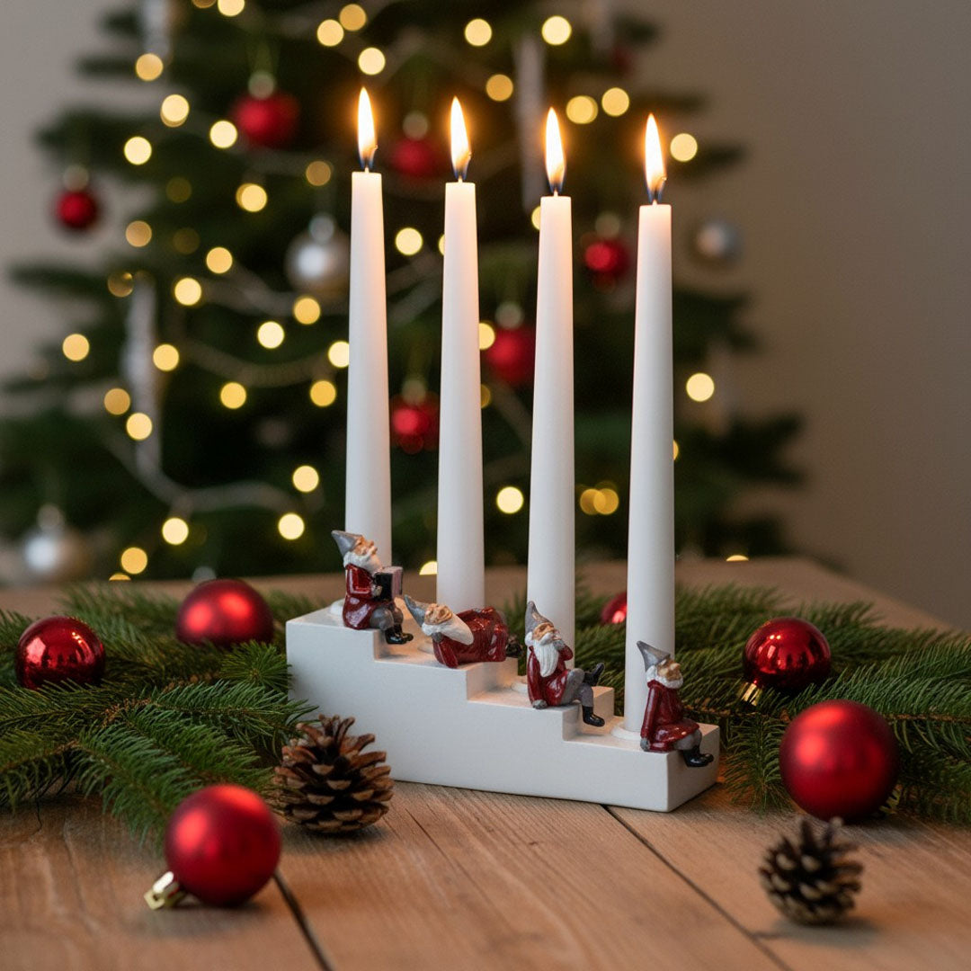 Verleihen Sie Ihrer Adventszeit einen besonderen Charme mit diesem liebevoll gestalteten Adventskerzenhalter mit 4 Wichteln von der schwedischen Marke Harvesttime. Die Wichtel sitzen fröhlich auf einer Treppe und sorgen für eine gemütliche und verspielte Atmosphäre rund um Ihre vier Adventskerzen.