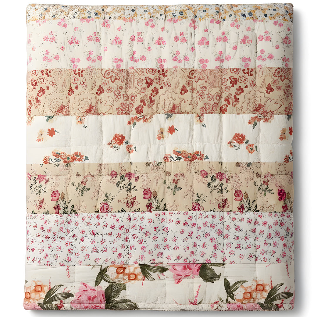 Bringen Sie Wärme, Farbe und romantische Atmosphäre in Ihr Zuhause mit der Moonmind Patchwork-Bettdecke in Blumenfarben. Diese große, handgequiltete Decke kombiniert zahlreiche florale Muster in zarten, warmen Tönen. Die vertikal angeordneten Patchwork-Streifen schaffen ein harmonisches und elegantes Gesamtbild, das Ihrem Schlafzimmer einen gemütlichen und liebevollen Charakter verleiht.
