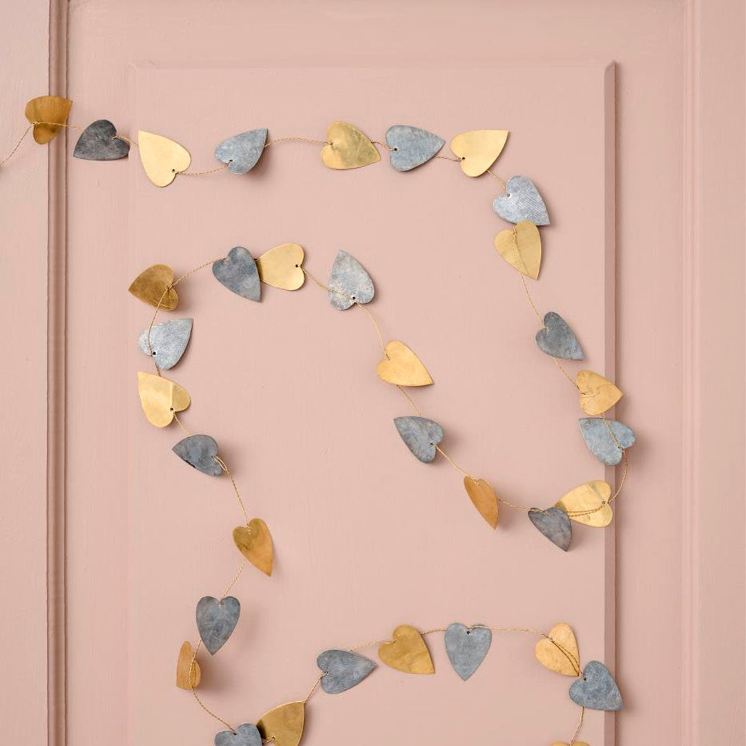 Handgefertigte Girlande mit Herzen in einer schönen Kombination aus Metall und Messing. Perfekt als dekorativer Anhänger in Fenstern, an Wänden oder als Teil kreativer Installationen, wobei sie Wärme, Eleganz und eine magische Weihnachtsstimmung verleiht.