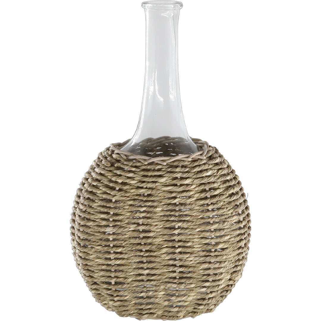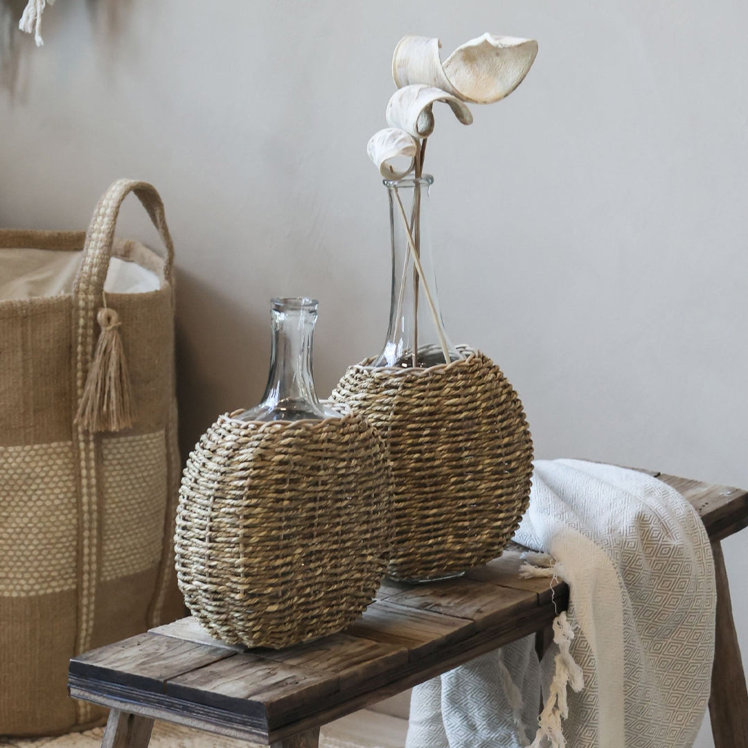 Elegante Glasflasche mit geflochtenem Boden und hohem Hals in schöner Naturfarbe. Die Kombination aus klarem Glas und handgeflochtenem Boden aus Jute und Zuckerrohr schafft einen warmen und natürlichen Ausdruck, der perfekt in nordische, boho-inspirierte und moderne Einrichtungsstile passt.