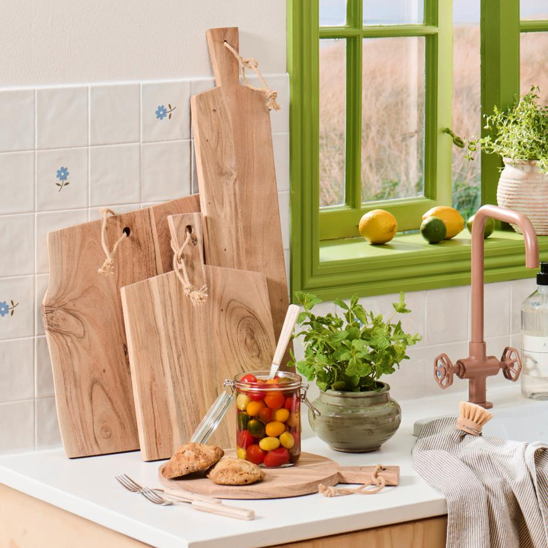 Verleihen Sie Ihrer Küche einen natürlichen und persönlichen Charakter mit diesem schönen Schneidebrett aus Akazienholz. Das Brett hat eine quadratische Form mit unregelmäßigen, natürlichen Kanten, wodurch jedes Brett ein UNIKA ist und seine eigene Charakteristik und Maserung besitzt.