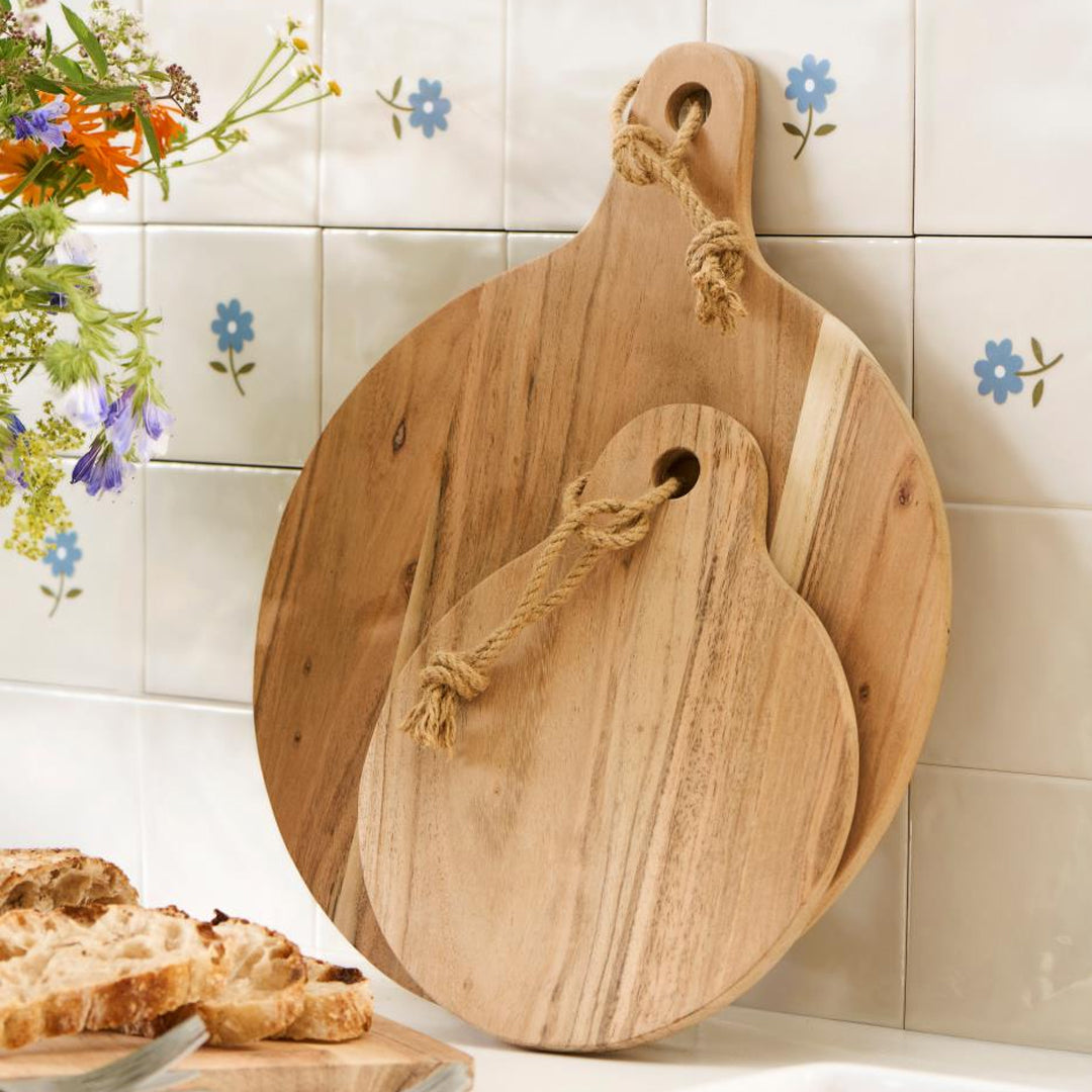 Das Schneidebrett ist perfekt für Brot, Tapas, Pizza oder kleine Speisen und dient gleichzeitig als dekoratives Element in der Küche. Es kann mit dem Juteseil aufgehängt werden, wenn es nicht in Gebrauch ist.