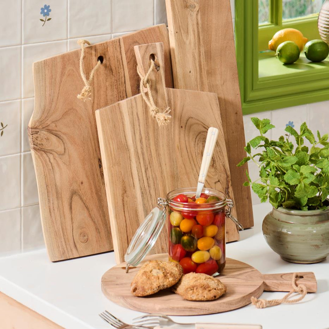 Dieses schöne und funktionale Schneidebrett aus Akazienholz hat eine runde Form mit Griff und Juteseil, was ihm einen natürlichen und rustikalen Ausdruck verleiht. Die warmen Farbtöne und lebendigen Maserungen des Holzes machen jedes Brett einzigartig und sowohl für den Gebrauch als auch für das Servieren geeignet.