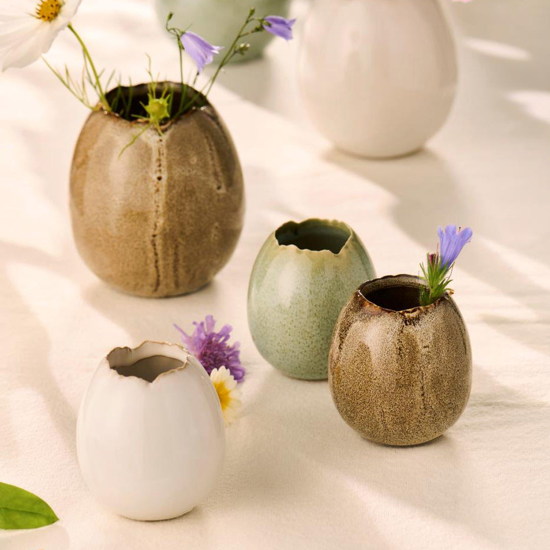 Die Vase ist ideal für eine einzelne Blume, eine kleine Knospe oder ein paar grüne Zweige. Verwenden Sie sie als stimmungsvolles Detail auf dem Ostertisch oder lassen Sie sie das ganze Jahr über als dezenten Hauch von Natur auf dem Frühstückstisch, der Fensterbank oder dem Regal stehen.