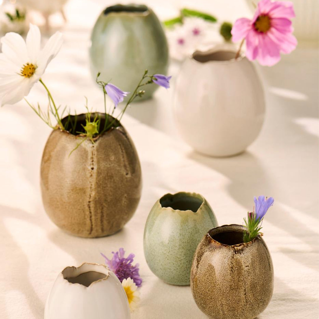 Die Vase ist ideal für eine einzelne Blume, eine kleine Knospe oder ein paar grüne Zweige. Verwenden Sie sie als stimmungsvolles Detail auf dem Ostertisch oder lassen Sie sie das ganze Jahr über als dezenten Hauch von Natur auf dem Frühstückstisch, der Fensterbank oder dem Regal stehen.
