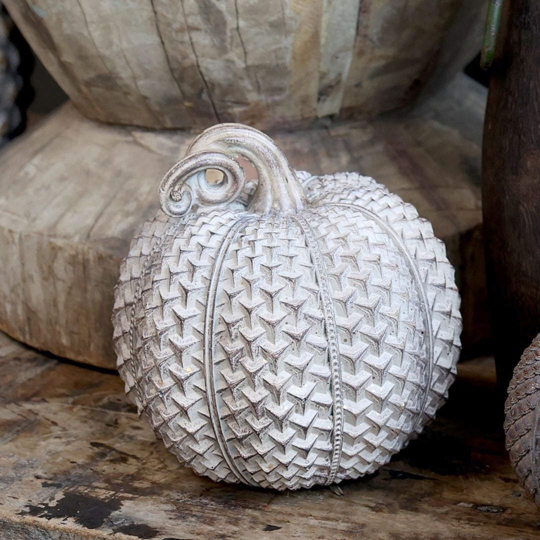 Veredeln Sie Ihre Herbstdekoration mit diesem charaktervollen Kürbis von Chic Antique. Die Antique-Latte-Oberfläche in Kombination mit dem vergoldeten Stiel und der einzigartigen Struktur sorgt für eine elegante und zugleich rustikale Atmosphäre – drinnen wie draußen.