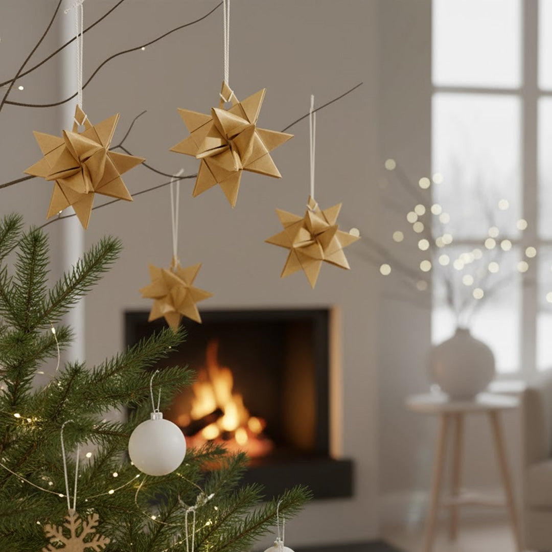 Schaffen Sie eine stimmungsvolle und schlichte Weihnachtsatmosphäre mit den Moonmind handgefalteten Papiersternen in warmem Naturton.