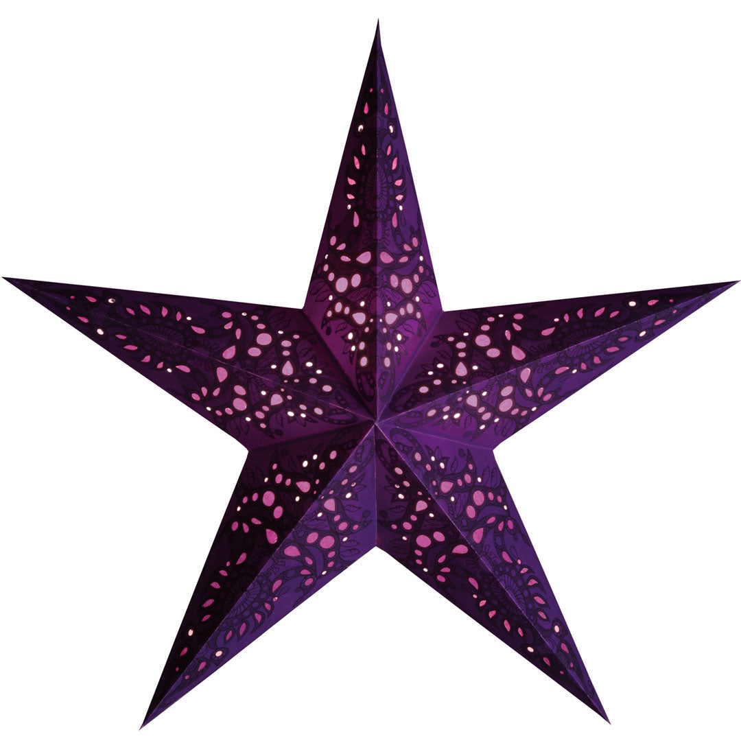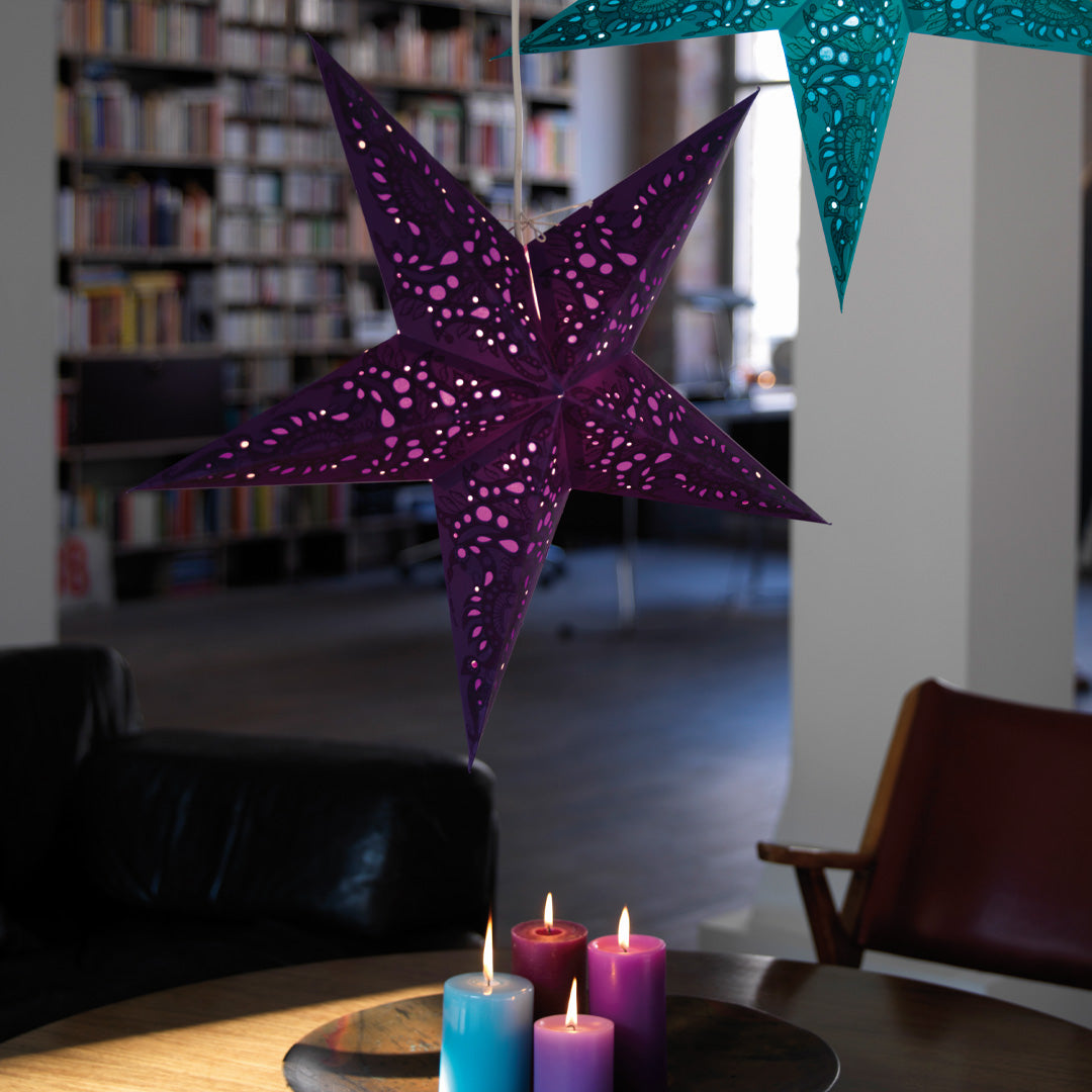 Die Mono Violett ist ein ausdrucksstarker Papierstern in tiefem Violett mit kunstvollen Mustern und filigranen Ausschnitten. Beleuchtet entsteht ein warmes und stimmungsvolles Lichtspiel, das jedem Raum eine gemütliche und einladende Atmosphäre verleiht.